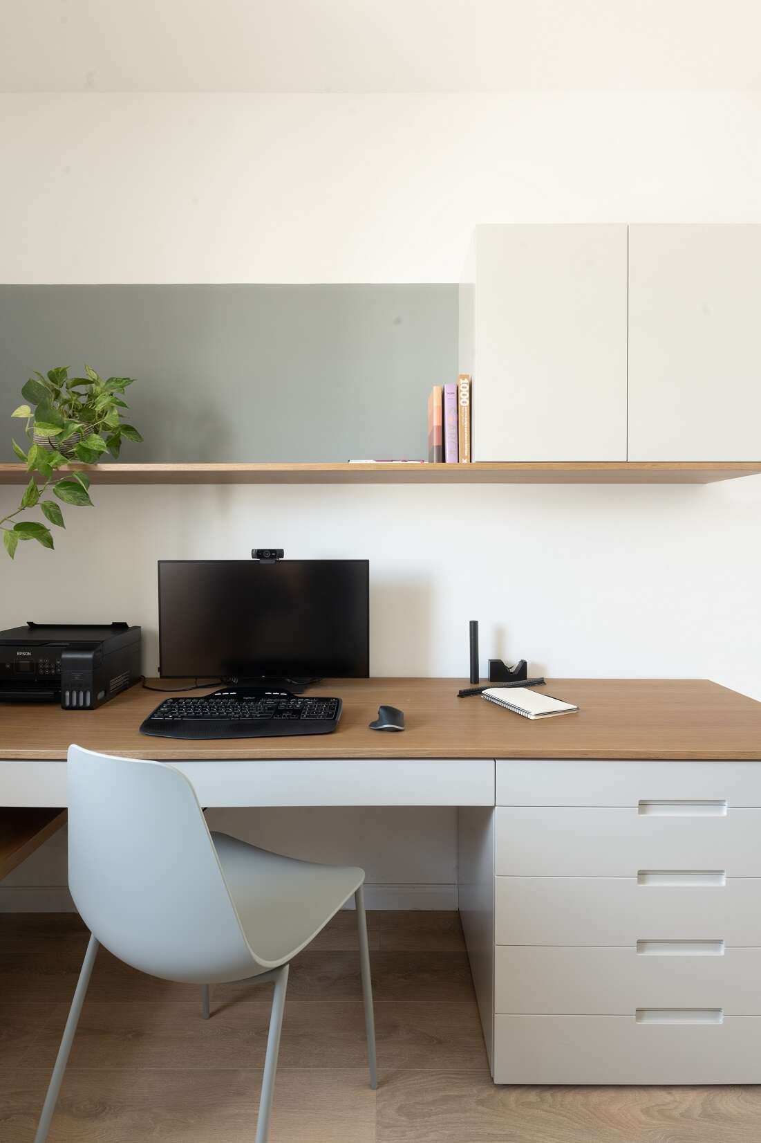 הממ"ד תוכנן כחדר עבודה וגם בו הוזמנה נגרות בהתאמה אישית, שמשלבת אחסון כללי לצרכי הבית, אבל גם מדפים לדקורציה ורקע מסוגנן לפגישות זום.