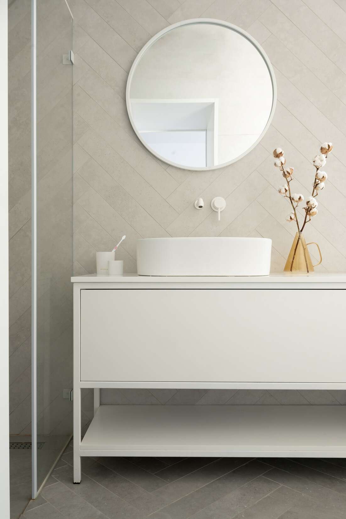 בחדר הרחצה נשמר מראה נקי של ספא בוטיק, וגם הברזים עצמם נבחרו בלבן. לקירות ולרצפה נבחר אריח בגוון אבן, ביישום פישבון (אידרת דג) לרצפה ולאחד הקירות בחלל.