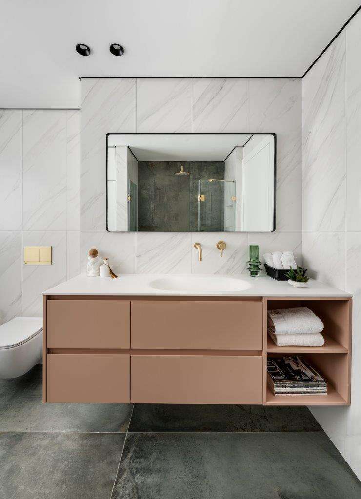 נגיעות של ניוד וגוון מוזהב בחלל הרחצה, צילום: עודד סמדר
