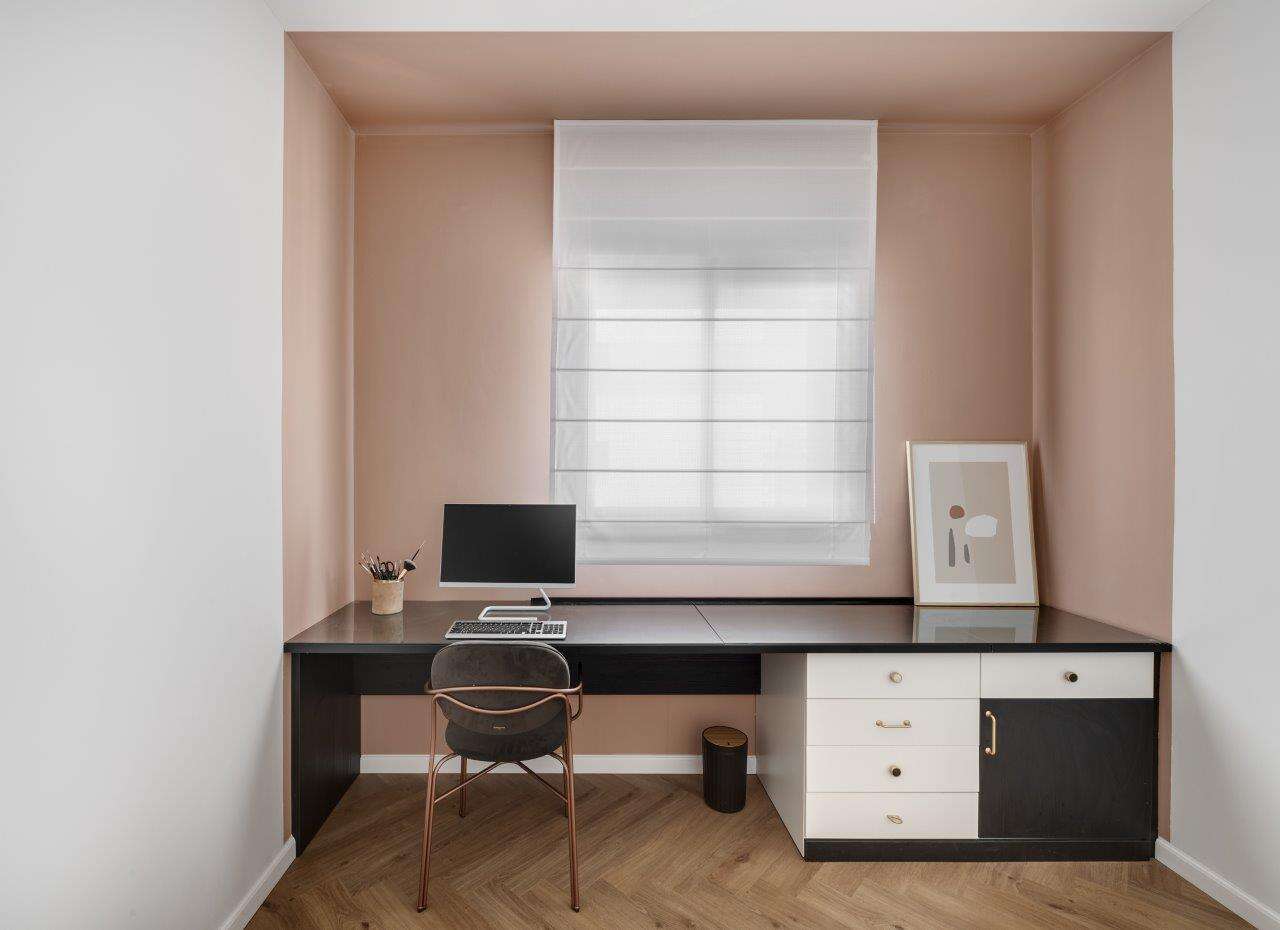 חדר העבודה הוא חדר היצירה של בעלת הבית. הצורך ביצירת שולחן רחב ופתרונות אחסון, הוביל לתכנון פריט נגרות מקורי שבו כל ידית שונה. שולחן העבודה קיבל את מלוא תשומת הלב כשהקירות סביבו נצבעו בגוון ניוד אפרסק שבעלת הבית אוהבת במיוחד.