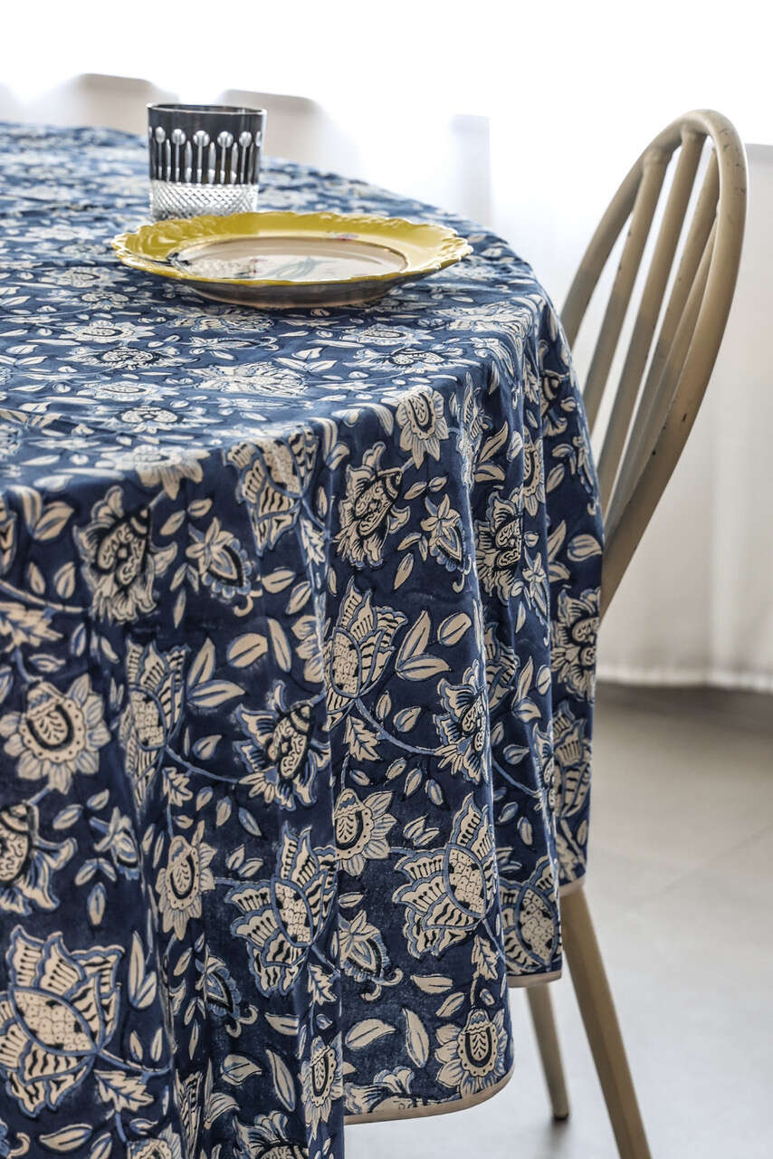 מפת כותנה כחולה עם עיטורים בלבן של גלביה // צילום: מלכה ניהו