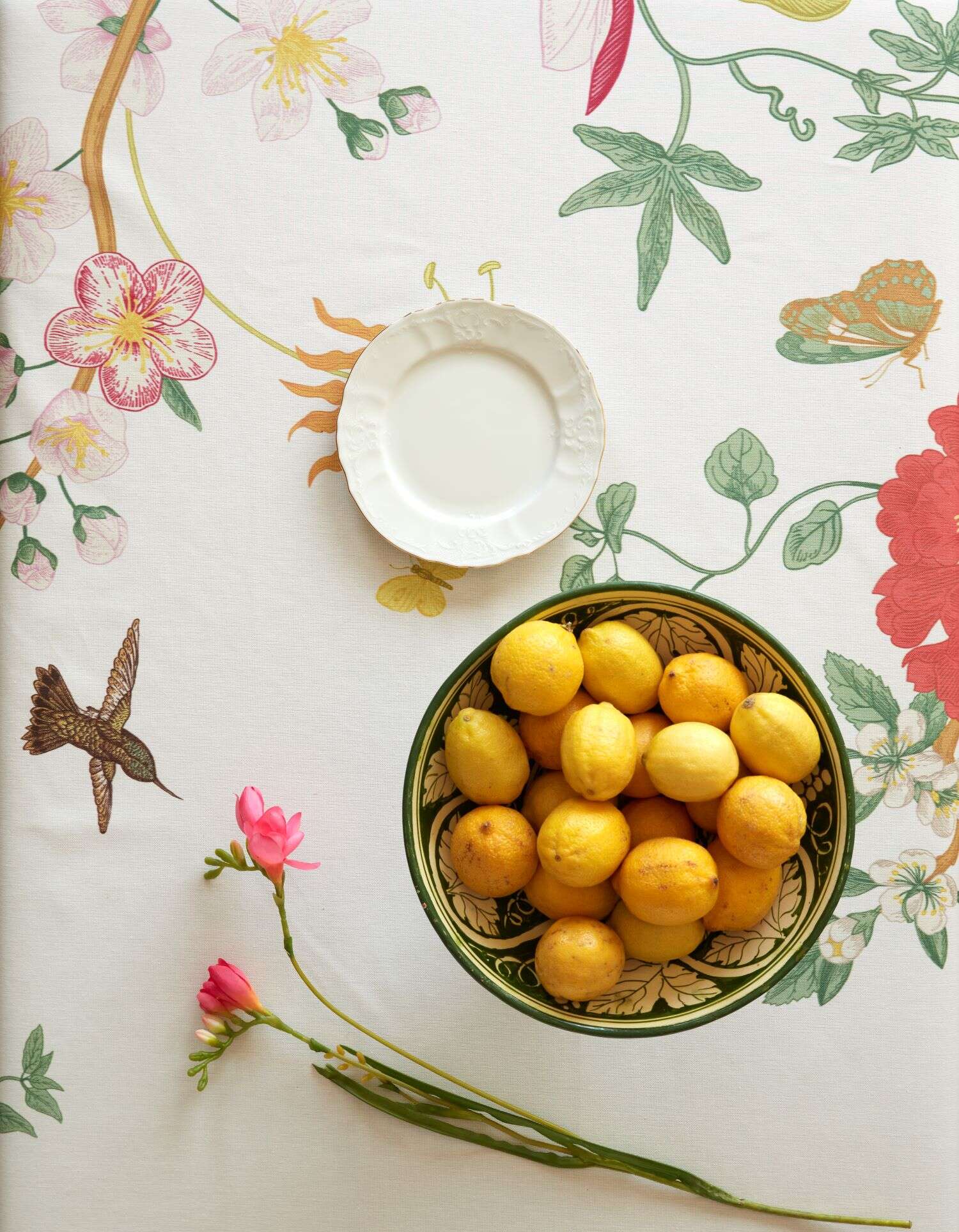 הדפסים בוטניים בגוון אדמדם על מפה של גלביה // צילום: מלכה ניהום