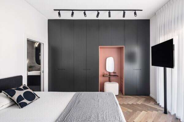 ביחידה הזוגית בולט ארון קיר עם חזיתות בגוון אפור גרפיט, שבמרכזו נישה עם פינת איפור שנצבעה בוורוד. עבור חדר הרחצה הזוגי התבקשה שינברגר לייצר אווירה ומראה של ספא. בהתאם לבקשה, היא בחרה בגוונים כהים ועמוקים – הקירות חופו בפסיפס שחור, במקלחת מוקמו אגנית שחורה ונישה מובנית לבקבוקים ותכשירי רחצה, וברזים בגימור נירוסטה מוברשת נבחרו למשימה. ארון הכיור המרשים חופה בפורניר שחור, והוא מכיל שני כיורים זה לצד זה, מעליהם שתי מראות בחיתוך CNC עם תאורה מובנית.