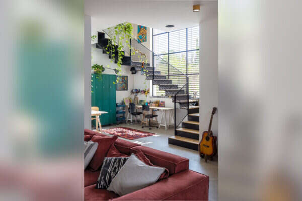 קווים לדמותה: שתי פינות עבודה שתוכננו בשני צדי החלל, אחת מתחת לגרם המדרגות והשנייה בקיר שממול, שגובל עם ספריית עץ שמשרתת את הסלון.