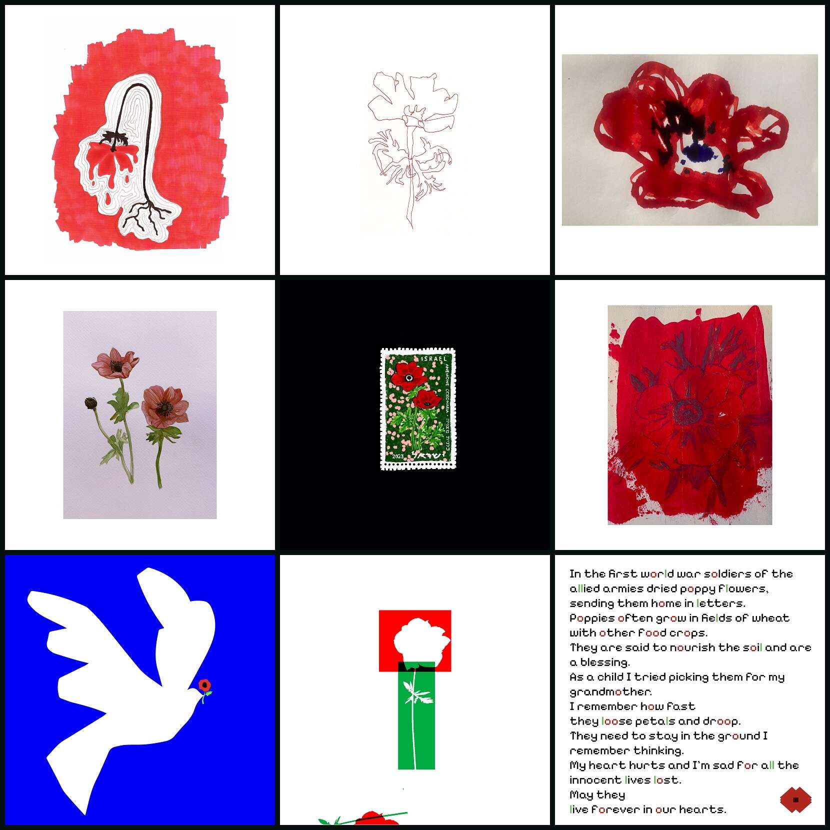 מאיר גנות עמה שוחחנו, ישבה בימים האחרונים וניסתה לתת ביטוי לתחושת הכאוס והטראומה הלאומית והפרטית, היא ציירה כלנית שהתכתבה מבחינתה עם "דרום אדום", אותם מרבדי כלניות שמאפיינים את אזור עוטף עזה. במהלך היצירה היא חשבה שההתמקדות בכלניות יכולה להיות תמה מרכזית עבור אמנים רבים, שיוכלו לתת גם הם ביטוי להתמודדות עם הכאב הגדול ועם תחושת הפחד הטראומטית. ההתמקדות בנושא אחד מקלה על האמן היוצר, מסבירה מאיר גנות. היא מסבירה שכשנותנים קצה חוט, זה מאוד מקל, במיוחד במצבים שבהם הלחץ והחרדה, לא מאפשרים מחשבה בהירה.