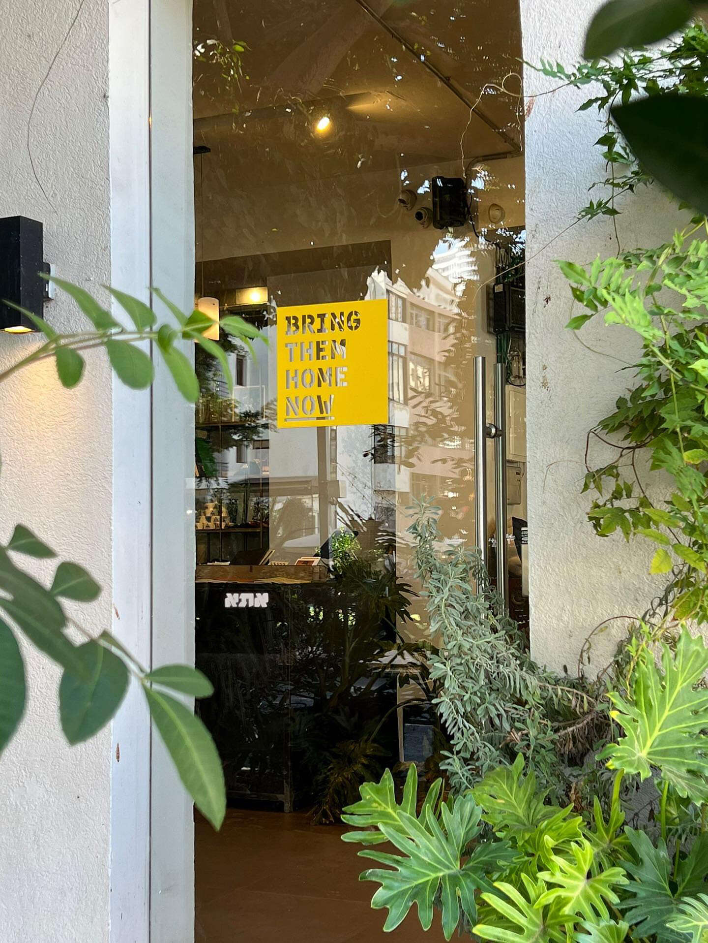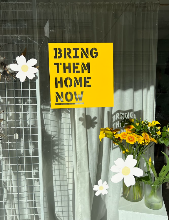 בתמיכת תורמים נוספים וסטודנטים מתנדבים, מופקות ומחולקות מדבקות ויניל צהובות לעסקים לתלייה בחלונות הראווה שלהם. המדבקות נושאות את הכיתוב BRING THEM HOME NOW.