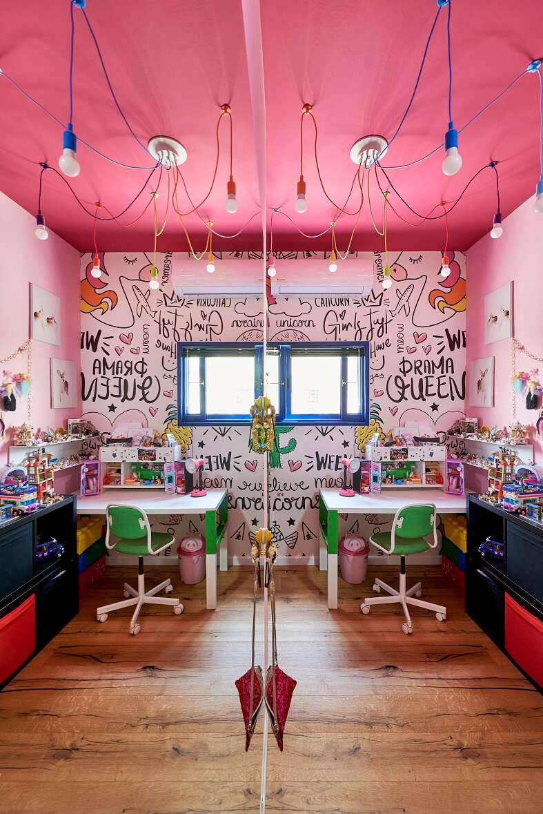 בחדרה של הבת, נצבעה תקרה בוורוד עז (0042A), קיר בוורוד בייבי (0031P) ומראה, וברקע החדר טפט דינמי. אצל הבן, נצבעו הקירות בגוון ירוק (0885T) והתקרה בטורקיז עמוק.