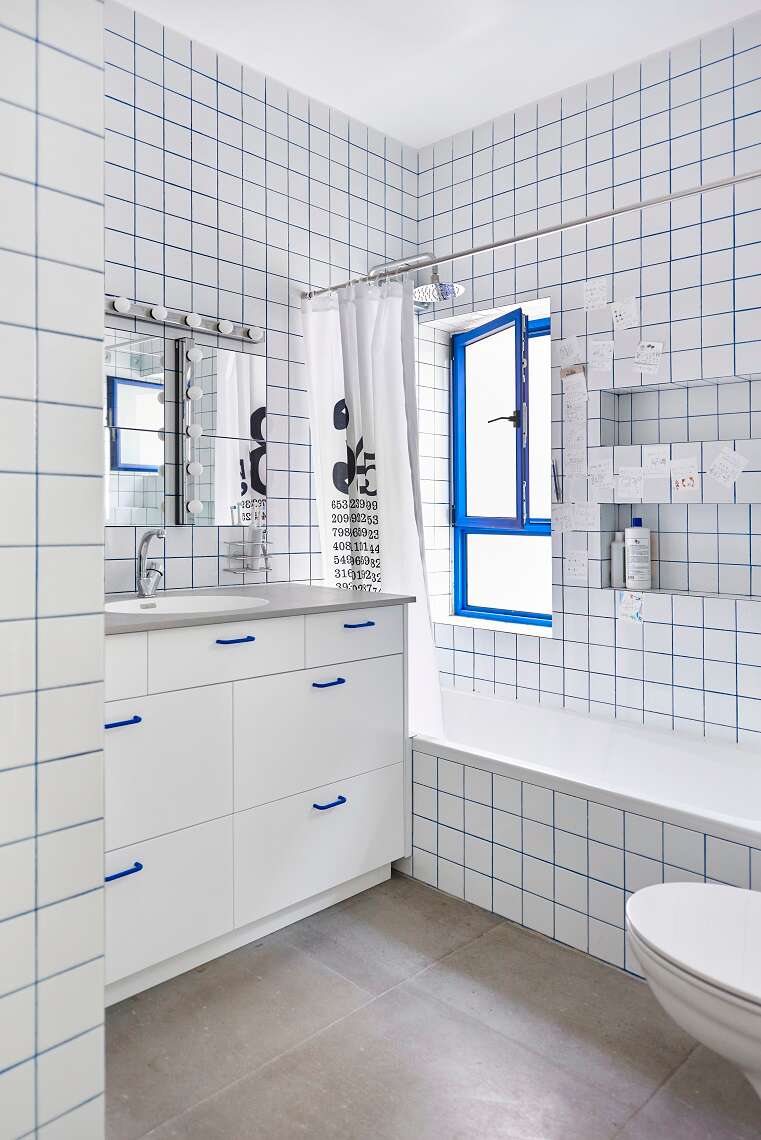 חדר הרחצה אחרי השיפוץ בהשראת מחברת דפי חשבון / צילום: סיגל סבן
