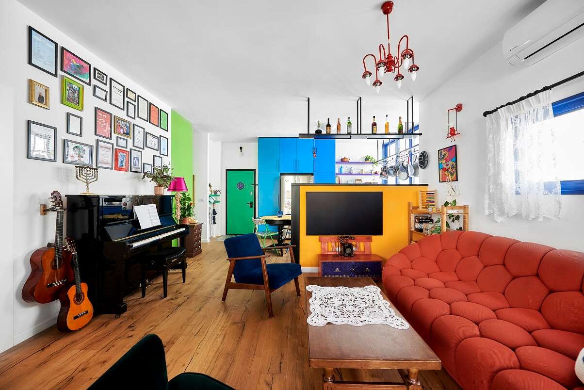 הסלון משלב ריהוט בגוונים משלימים של כתום וכחול, והמטבח הוא מניפת גוונים שמשלבת נגרות ירוקה מול הכניסה וקיר צהוב (0525A) שגובל בסלון.
