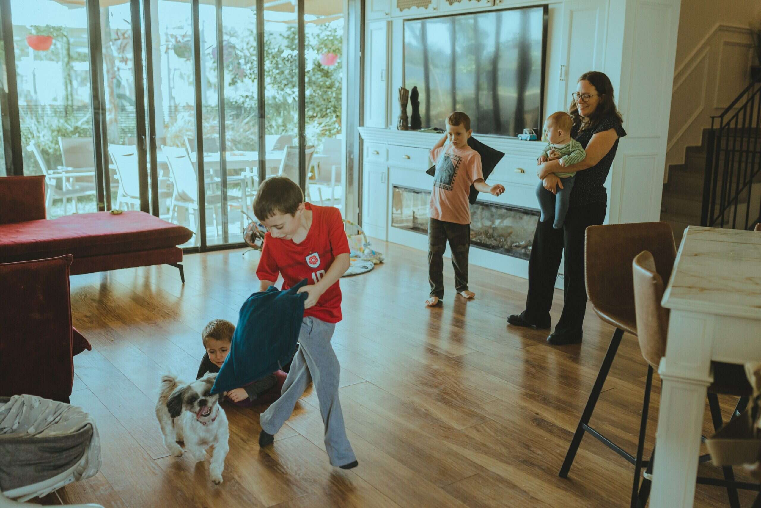 קוהן תפסה רגע הכי פשוט לכאורה, של הדס וארבעת ילדיה, בלב חלל המגורים, עם רצפת פרקט שמחממת את האווירה ומפתחים רחבים שפונים אל שטחי החוץ. מי שמתבונן מהצד יכול לחשוב שהכל רגיל. בתמונה הזאת מודגשת עוצמתו של עיצוב הפנים ושל היכולת לייצר חלל חמים ומשפחתי, שיתמוך את הרגעים המאתגרים.
