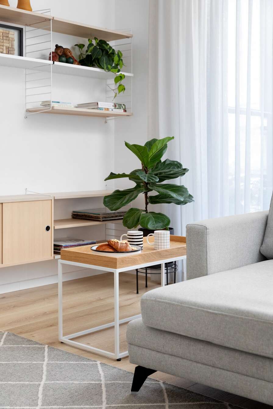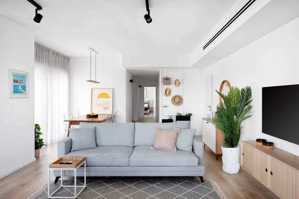 על מנת להפוך את הדירה למוארת ומזמינה, נבחר פרקט עץ אלון מולבן שסיפק רקע נקי לעיצוב כל הבית. הצבעים הבולטים בדירה הם גווני אפור רכים, לבן, שחור ועץ בשילוב צמחיה ירוקה.
