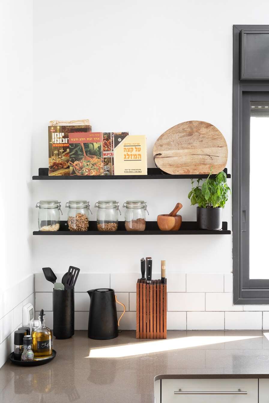 המטבח אחרי השיפוץ - מדפי תצוגה עשויים מתכת מדוקקת / צילום: שירן כרמל