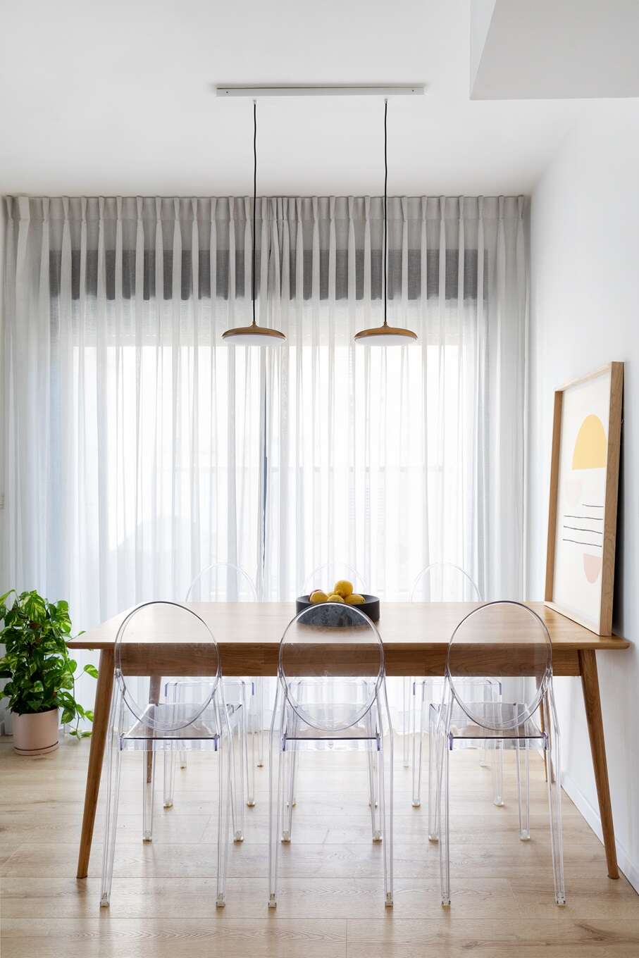 בפינת האוכל שולחן מינימליסטי מעץ אלון מלא (רהיטי טבע), וכיסאות אוכל שקופים שהועברו מהדירה הקודמת ומקנים לפינת האוכל מידה של עידון.