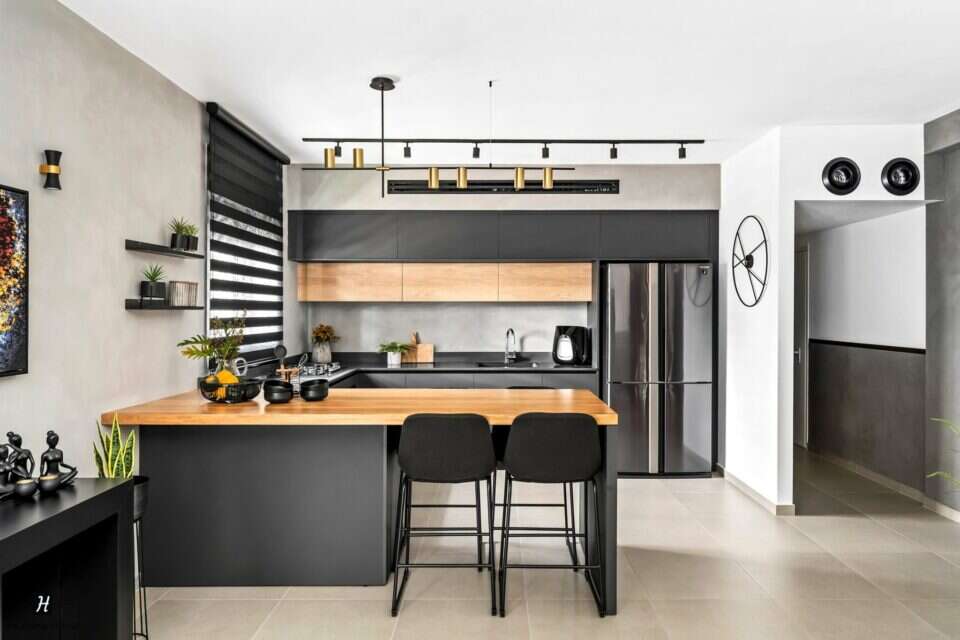 הדירה מעוצבת בסגנון עכשווי, שמפגיש קו אלגנטי (שחור, מוזהב) עם הלך רוח צעיר ודינמי (בטון, מדפי מטאל). המפגשים בין האלגנטי המאופק לצעיר הדינאמי באים לביטוי בחללי הבית השונים וחשוב להתעכב עליהם. מפגשים בין עולמות, בין חומרים ובין סגנונות ותתי סגנונות יוצרים מתח עיצובי, שמהווה את הסוד הקטן לעניין גדול שתוכלו ליצור בכל חלל.