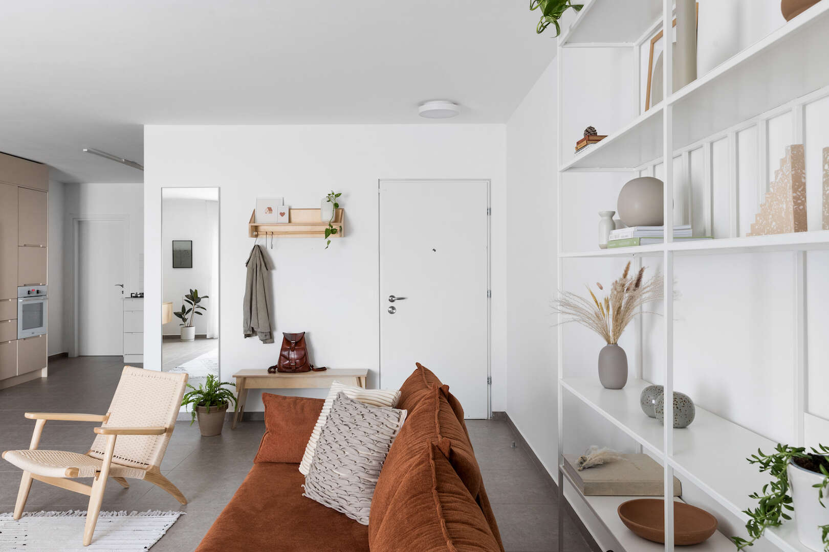 הטיפ המרכזי: זוכרים את חוק ה- 70%, 20%, 10%? הדירה הזאת מהווה דוגמה מעולה ליישום נכון ומדויק של החוק הזה. 70% מהשטח מוקדש לגוון לבן, 20% לעץ לבנה בגוון קרמי מעודן, שנושק ללבן, ו-10% ספה רחבת ידיים בגוון טרה קוטה, מהגוונים המובילים והטרנדים בשנה האחרונה. שמוקמה בסלון, שכולל גם ספריית ברזל לבנה שעוצבה בעבודת מסגר בהתאמה אישית וכורסת ראטן.