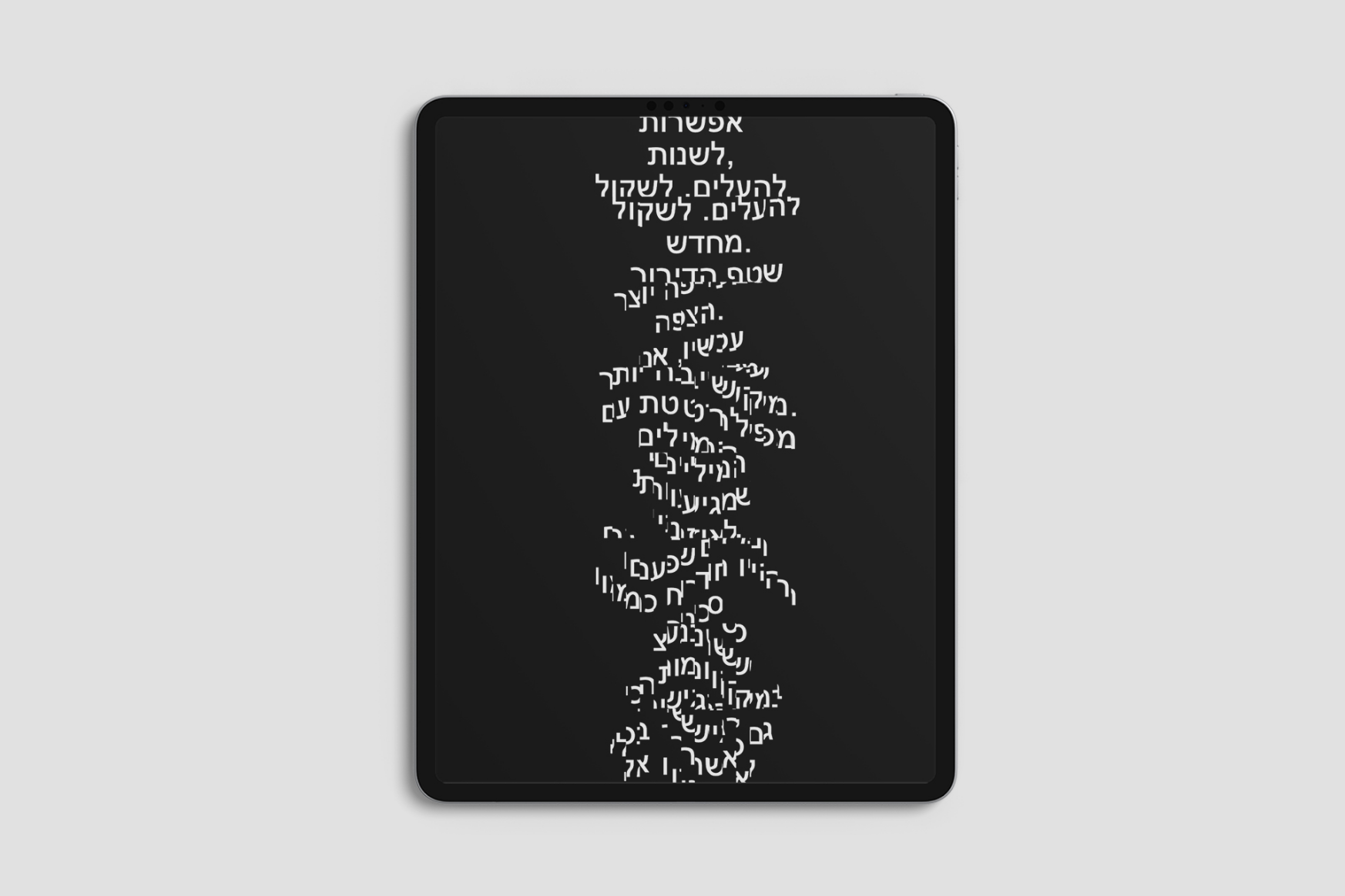 פיתוח מודל טיפוגרפי מבוסס קוד לממשקים דיגיטליים, המתמקד במצבי הרוח ובנסיבות בשעת הכתיבה. ההנחה היא שהמצב הרגשי והמנטלי של הכותב משתקף בכתיבה, כמו בדיבור, ולכן יכול לבוא לידי ביטוי חזותי גרפי, גם בפונט וגם בגריד. הרעיון מציע אלגוריתם שיוצר אוטומציה טיפוגרפית בעת הכתיבה דרך מיפוי מצב הרוח על פי שני צירים עיקריים רמת העוררות ורמת המתח /נעימות.