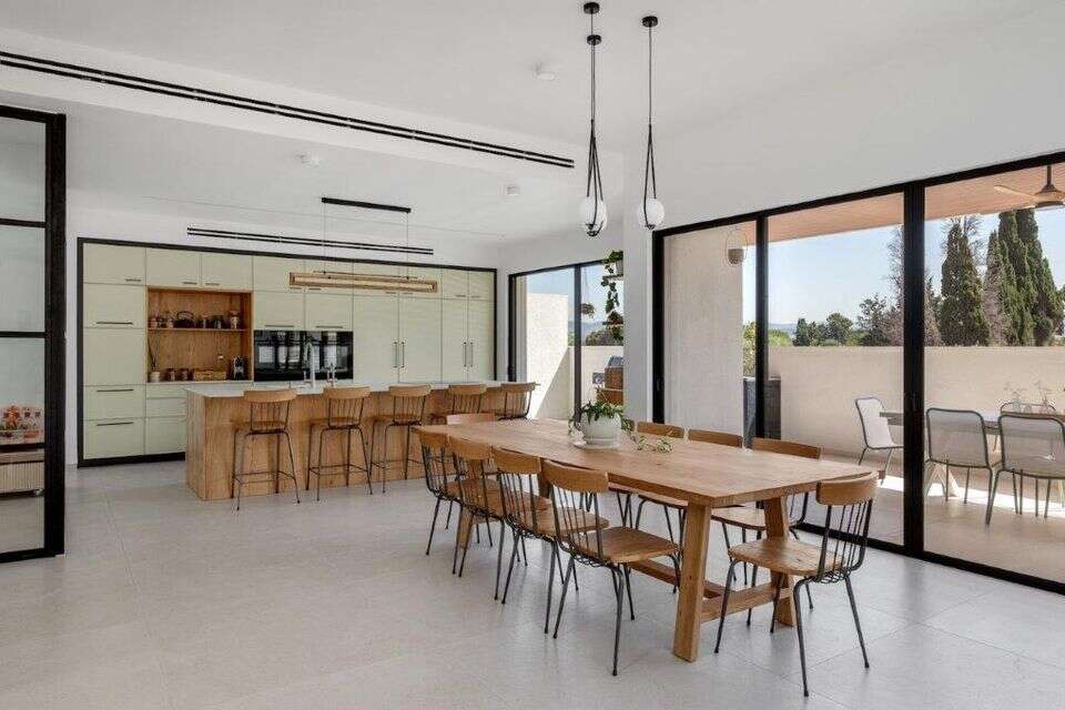 המטבח פרללי, תוכנן כשני קווים מקבילים - פס ארונות מתקרה עד רצפה ומקביל אליו אי, שמאפשר התכנסות וארוחה משותפת של בני המשפחה. העץ, כחומר מרכזי, השתלב גם באי, בכסאות האוכל וגם במדפים הפנימיים של חלק מהארונות.