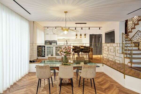 "בני הזוג ביקשו לשמור על פינת האוכל הנוכחית, והאמת זרמתי עם הרעיון. אני בכלל חושבת שיש פריטים סנטימנטליים שנכון לשמור ולשלב גם בבית משופץ". בחלל הציבורי הוטמעו גוונים פסטלים כמו כורסאות פודרה, ובתוכו שולבו שפע ציורים ואמנות על הקיר פרי מכחולה של האחות של בעלת הבית", מסבירה ואקס.