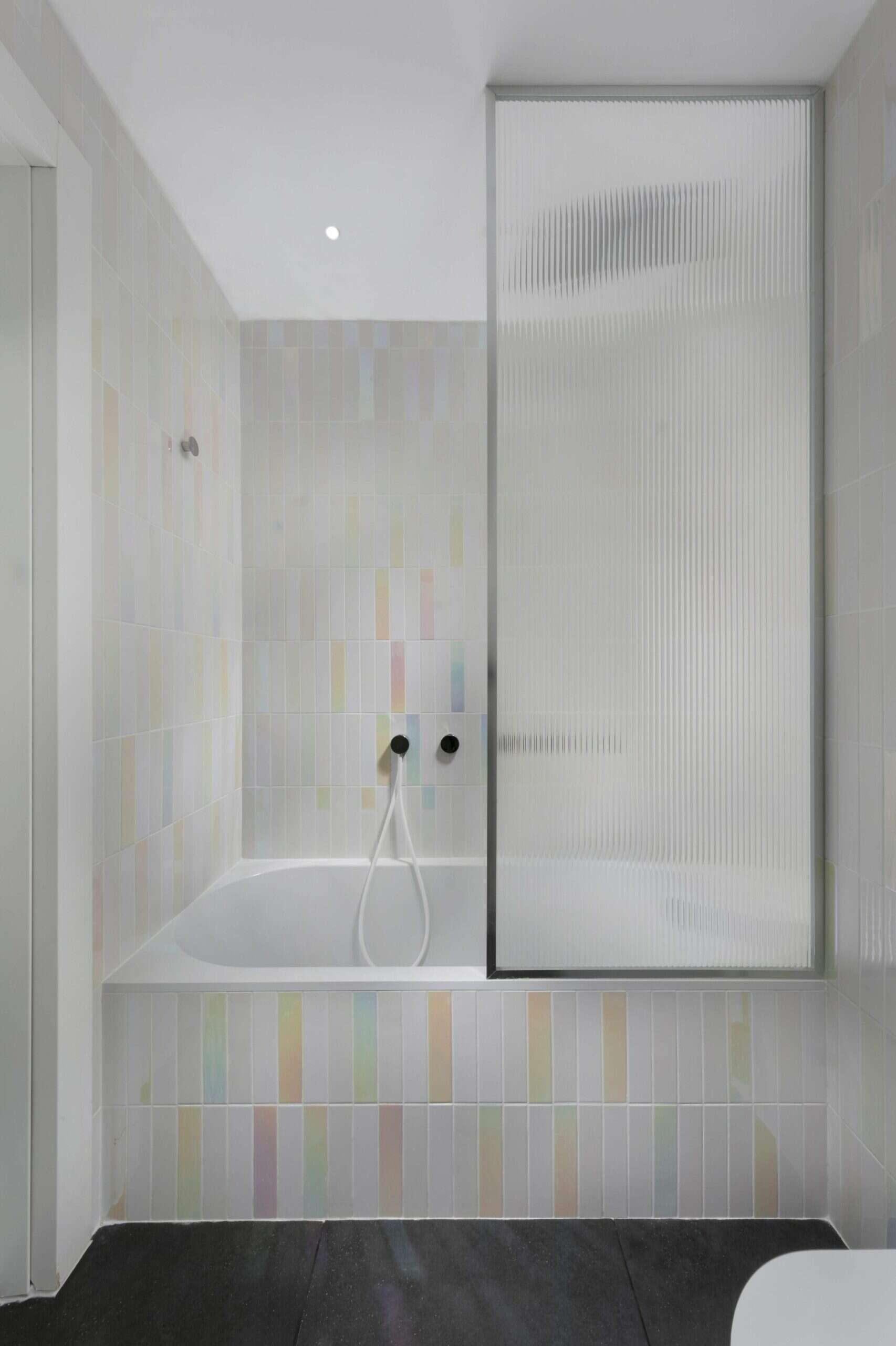 חדר הרחצה הכללי, המשרת את הבן, עוצב באריחי יוניקורן של המותג האיטלקי 41 zero 42, היוצרים הולוגרמת צבעים משתנה על גבי רקע בהיר.