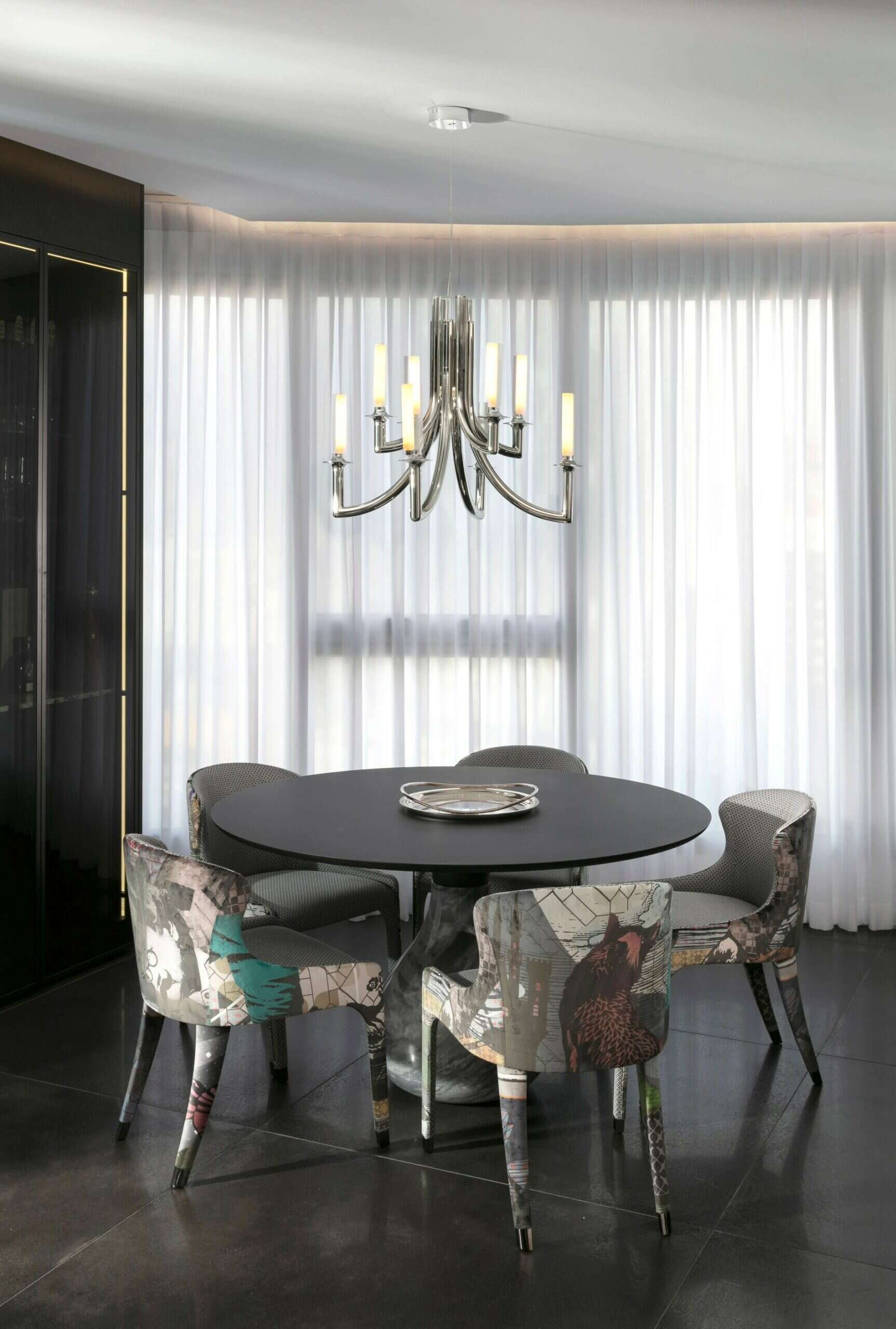 פינת האוכל, הממוקמת בסמוך למרפסת, נבנתה סביב שולחן ייחודי, אלמנט עיצובי קבוע המורכב מגוש שיש מפוסל במשקל 350 ק"ג, מעליו פלטת עץ כהה. הכיסאות מבית המותג "רוש בובואה" עברו עיבוד מחודש ורופדו בבד מקולקציית LONDON של המעצב מרסל ונדרס — תהליך מורכב שדרש עבודה משותפת עם היבואן ובית היוצר בחו"ל.