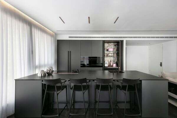 המטבח עוצב בקו דרמטי ונקי, עם חזיתות בגוון אפור גרפיט ומשטח אי מגרניט שחורה יוקרתית. תכנון ייחודי הוסיף מערכת ארונות קונספטה עם דלתות מתקפלות, המסתירות מכשירי חשמל קטנים כמו מיקסר, טוסטר ומכונת אספרסו. בדופן הגובלת בסלון שולבו מקררי יינות.