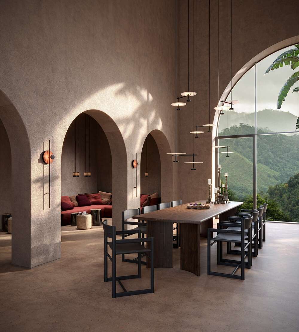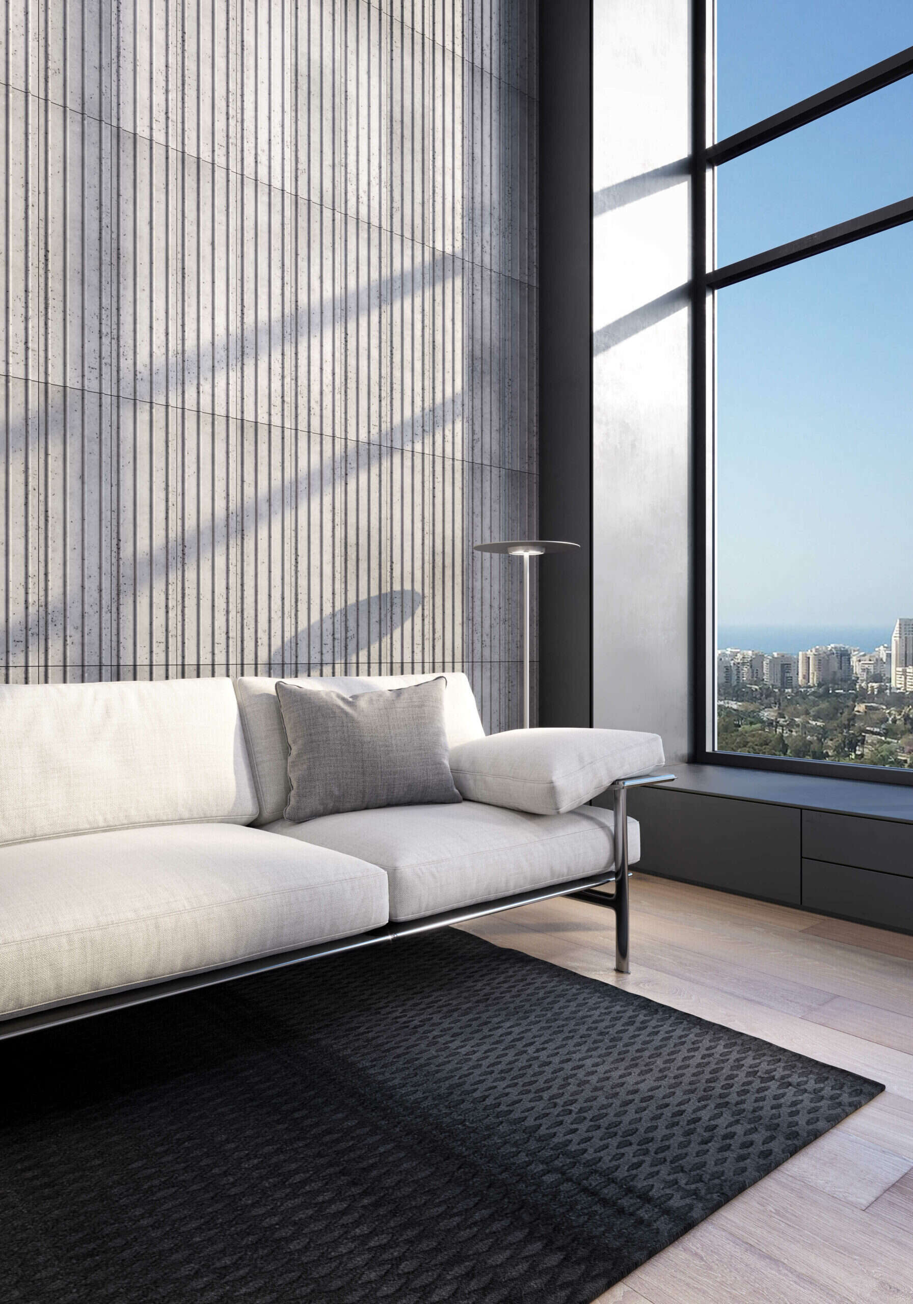קיר חלל מגורים מחופה אריחי בטון, מתוך קולקציית מקבילים / הדמיה: מעיין גולן
