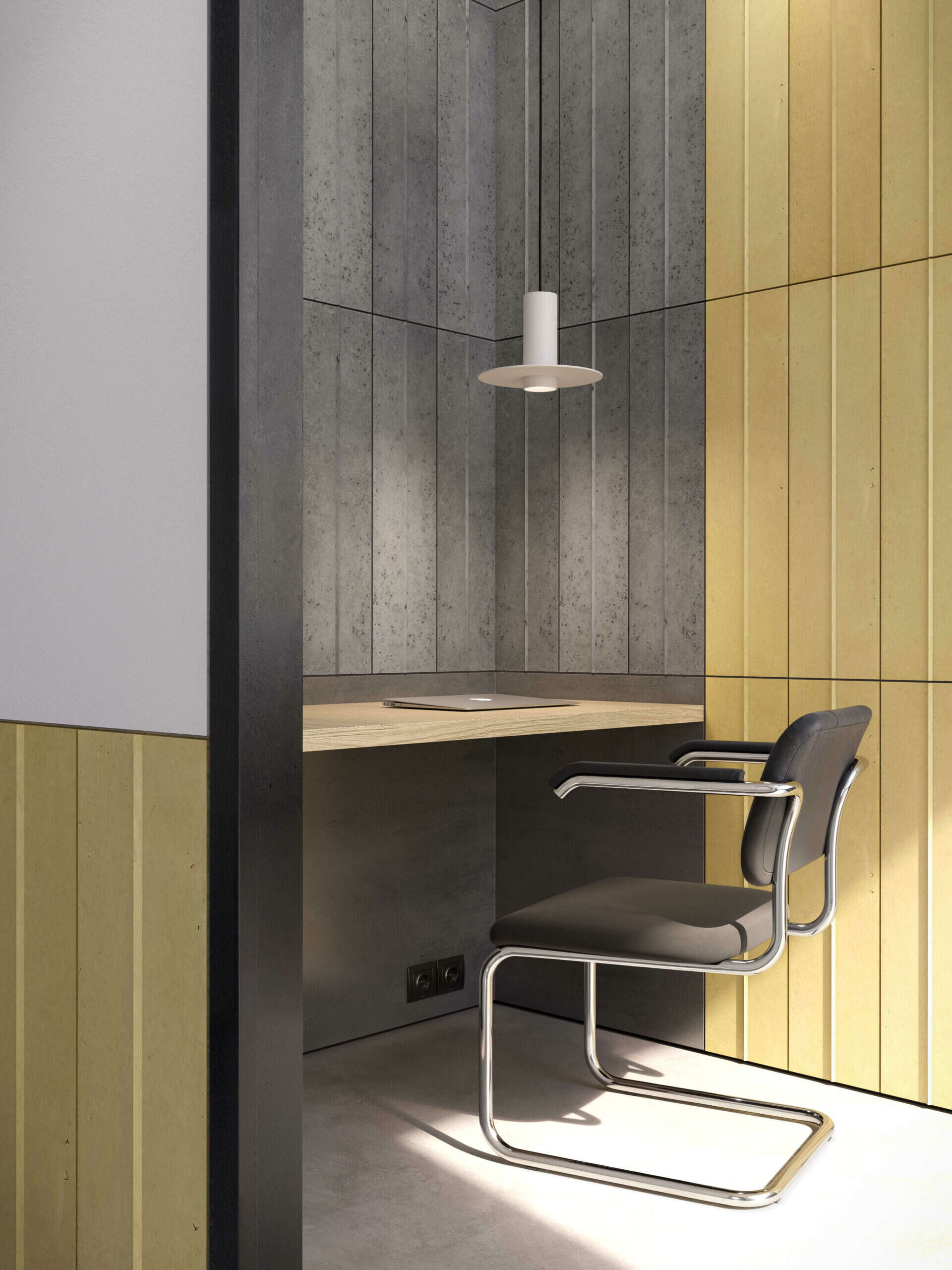פינה משרדית מחופה אריחי בטון, מתוך קולקציית מקבילים / הדמיה: מעיין גולן