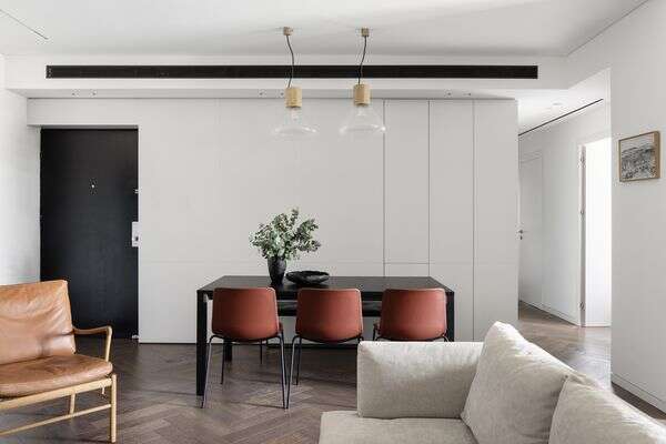 השיפוץ כלל בנוסף את הגדלת המטבח, ביטול שירותי האורחים לטובת פינת עבודה חכמה, שילוב מקומות אחסון סמויים ונגרות אינטגרלית שממשיכה כחוט מקשר לכל אורך הדירה. לצד אלה, שולבו טכנולוגיות מתקדמות – מערכת חשמל חכם שמאפשרת שליטה על התאורה, הווילונות והמיזוג בלחיצת כפתור, וגם חימום רצפתי שמכניס שכבת נוחות נוספת.