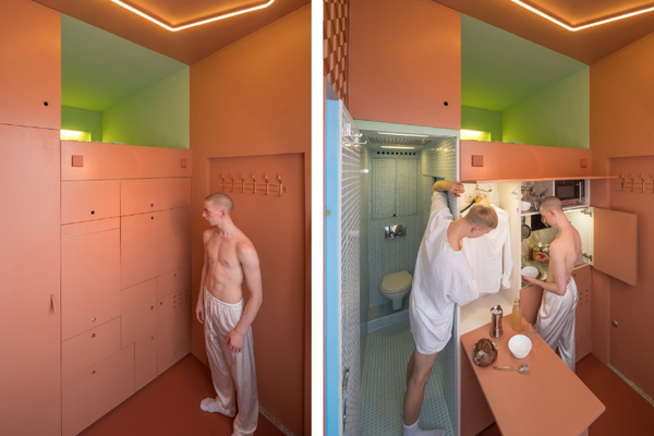 בסך הכל מדובר בשטח של 6.89 מ"ר בלבד, הכוללים גם שתי סאונות אינפרא אדום וג'קוזי. היא אולי קטנה, אבל לא זולה וחכמה במיוחד - הדירה מאורגנת בארבעה מרחבים שונים לחלוטין בחומרים ובגבהים: סלון בגובה 3 מטר, חדר שינה בגובה 1.14 מטר עם הרבה אחסון, שירותים עם מקלחת גשם, וספא. הספא הוא החלל הכי סגור בקבנון - החדר בתוך החדר.