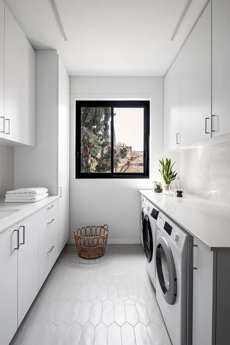 זו חלופה מאוד מקובלת בדירות האורבניות בערים אירופיות כמו מילנו או פריז - שילוב של מכונת כביסה ומייבש מאחורי דלתות המטבח, עם תאי שירות חכמים ואפשרות לאחסון ציוד נוסף.
