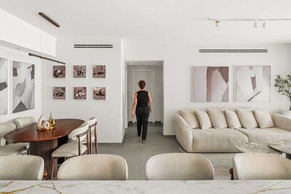 מדובר בדירת חמישה חדרים בשטח של כ־120 מ"ר, שנרכשה מקבלן אך עברה התאמה מלאה לצרכי המשפחה. אהרוני, שמכירה היטב את בני הזוג, הצליחה לזקק את החזון שלהם לכדי בית חדש שמשלב פרקטיות יומיומית עם עיצוב מוקפד. השניים עברו למעשה רק כתובת, לרחוב חדש אך לא רחוק מזה שבו התגוררו קודם, אך את הבית בחרו לעצב מהיסוד.