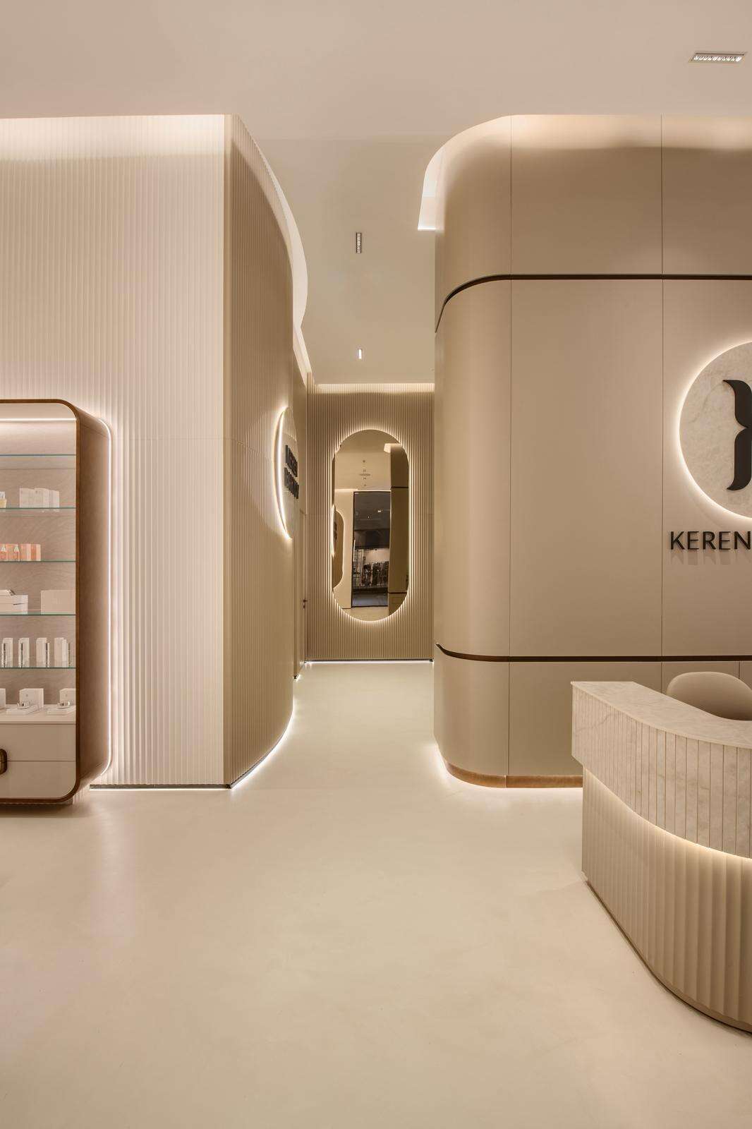 העיצוב הפנימי מושפע מבתי אופנה אירופיים, עם גווני עור טבעיים, קירות מעוגלים ותקרות בגובה 4.5 מטרים. רצפת רזינה בגוון ניוד-שמנת מחזירה את האור כזוהר עדין, והמעברים בין הקבלה לחדרי הטיפול נראים כמעט כנשימה מתמשכת של אור וחומר.