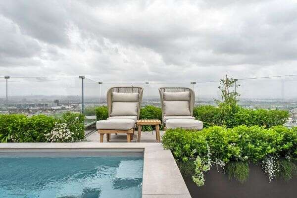 הגג עוצב כמתחם אירוח שלם עם בריכה מוגבהת, מטבחון חוץ, בר ישיבה, פינת אוכל, אזורי שיזוף ופינות ישיבה מגוונות. הנוף הנשקף ממנו משלב את הירוק של השרון עם קו הרקיע של גוש דן - ותחושת הווילה הצפה מעל העיר נוכחת בכל רגע.
