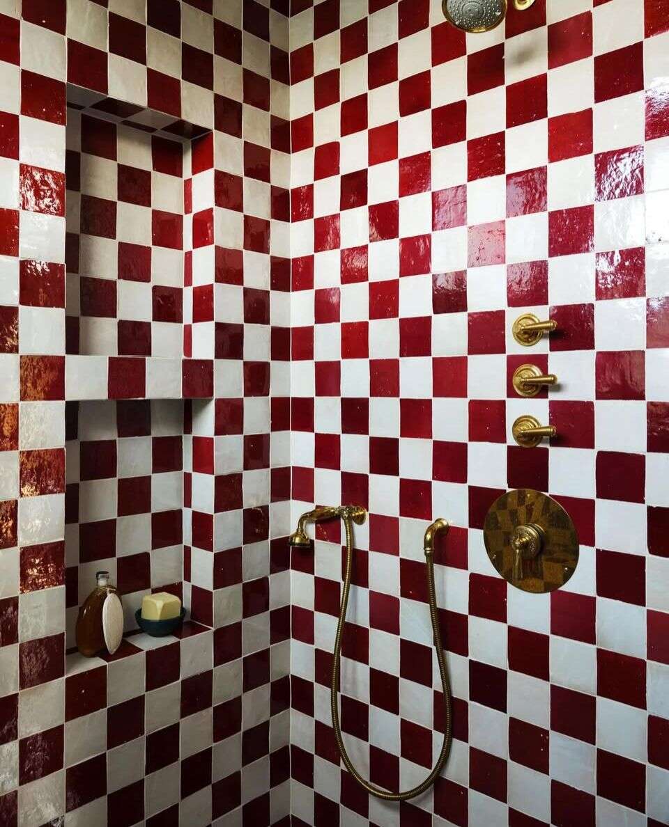 חדר האמבטיה שלה עוצב בכמה מהצבעים האהובים עליה, כפי שבא לידי ביטוי בקירות המשלבים אדום ולבן, ממש כמו ברצפות המעוטרות של המטבח שלה.
