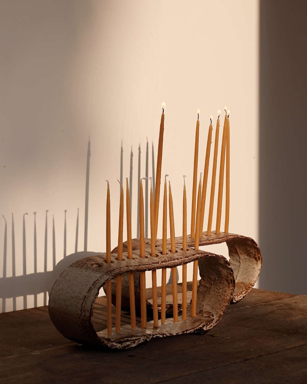 קני הנרות יוצרים מנח שבו הנרות אינם עומדים באופן ישר ומהוקצע, אלא חופשי יותר, כמעט אינטואיטיבי. גימור הקרמיקה אינו אחיד, ומדגיש את עבודת היד, את החומר ואת התהליך – בחירה שמרחיקה מהשלמות התעשייתית ומקרבת לאנושי.