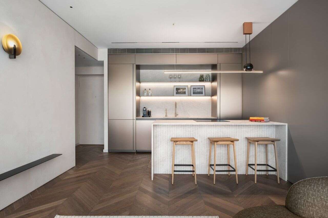 המטבח תוכנן כחלק אינטגרלי מהחלל הציבורי, כמעט כרהיט בפני עצמו. חיפוי הקיר ממשיך את השפה האחידה של הדירה ומשלב את הדלת הנסתרת, בעוד הנגרות בהתאמה אישית מאפשרת אחסון חכם ושומרת על מראה מינימליסטי ונקי.
