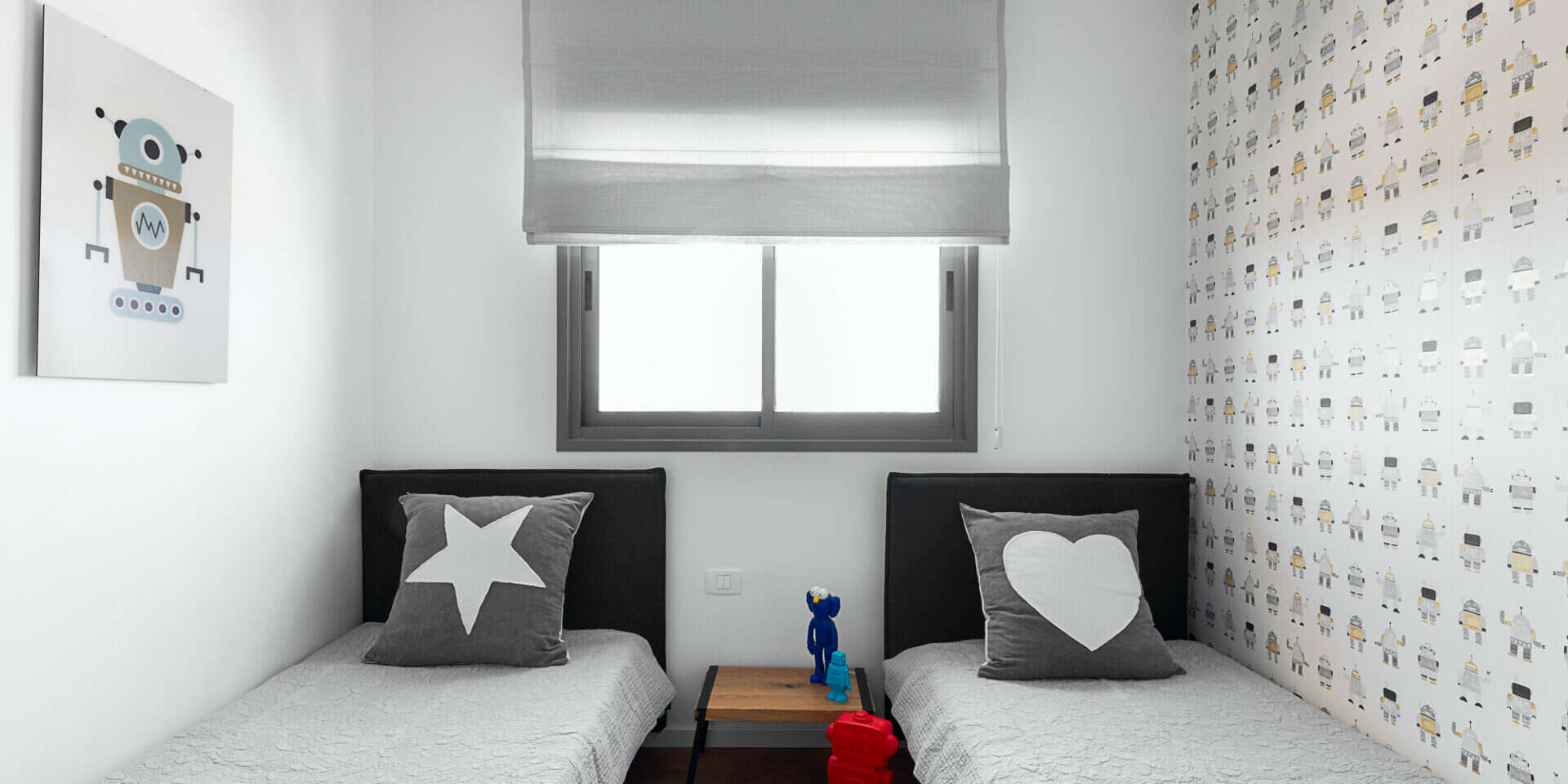 לצבעוניות משקל רב בהתוויית הסגנון והאווירה בחלל. בפרויקט הזה הילדים היו מעורבים, וכל אחד בחר לעצמו את פלטת הגוונים - החדר של הבת הגדולה עוצב בגווני אפור כהה ולבן בשילוב של בורגונדי עז, בחדר הבת הקטנה שולבו טונים בהירים יותר של אפור ולבן, ואילו בחדר הבנים נבחר טפט רובוטים, שממנו נגזרו גם הפוסטרים שעוצבו במיוחד לחדר זה. בכל החדרים הותקן פרקט אלון מעושן בדוגמת פיש בון.