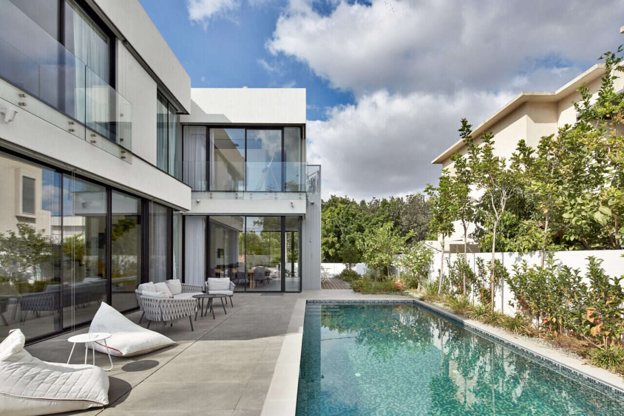 הכי מיוחד: השימוש בחלונות עם פרופיל שכמעט ואינו נראה לעין, מה שמחבר את המרפסת רחבת הידיים עם חלל הפרגולה והסלון שבתוך הבית.