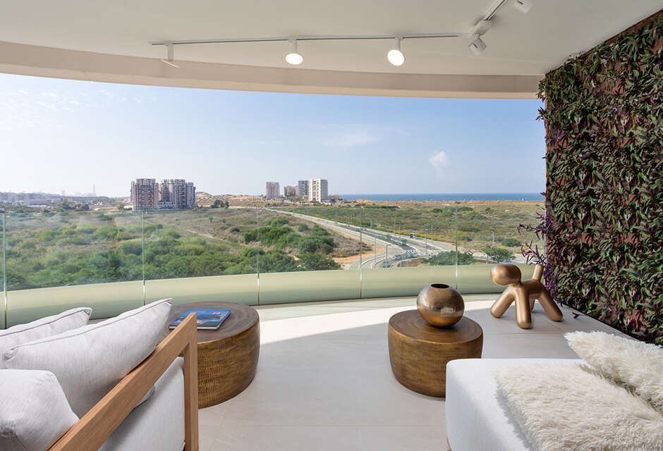 בשל מיקומו של הפרויקט, המרפסת נהנית מקו ישיר אל חופי הים של צפון תל אביב. הצבעוניות שמאפיינת אותה משלבת גוונים בהירים ורכים שמעניקים כבוד לנוף. על מנת לייצר הפרדה אופטימלית מהשכנים, בחרה סלע להחליף את קיר הזכוכית הקיים שבמרפסת בקונסטרוקציית ברזל שעל גבה נשתל קיר ירוק.