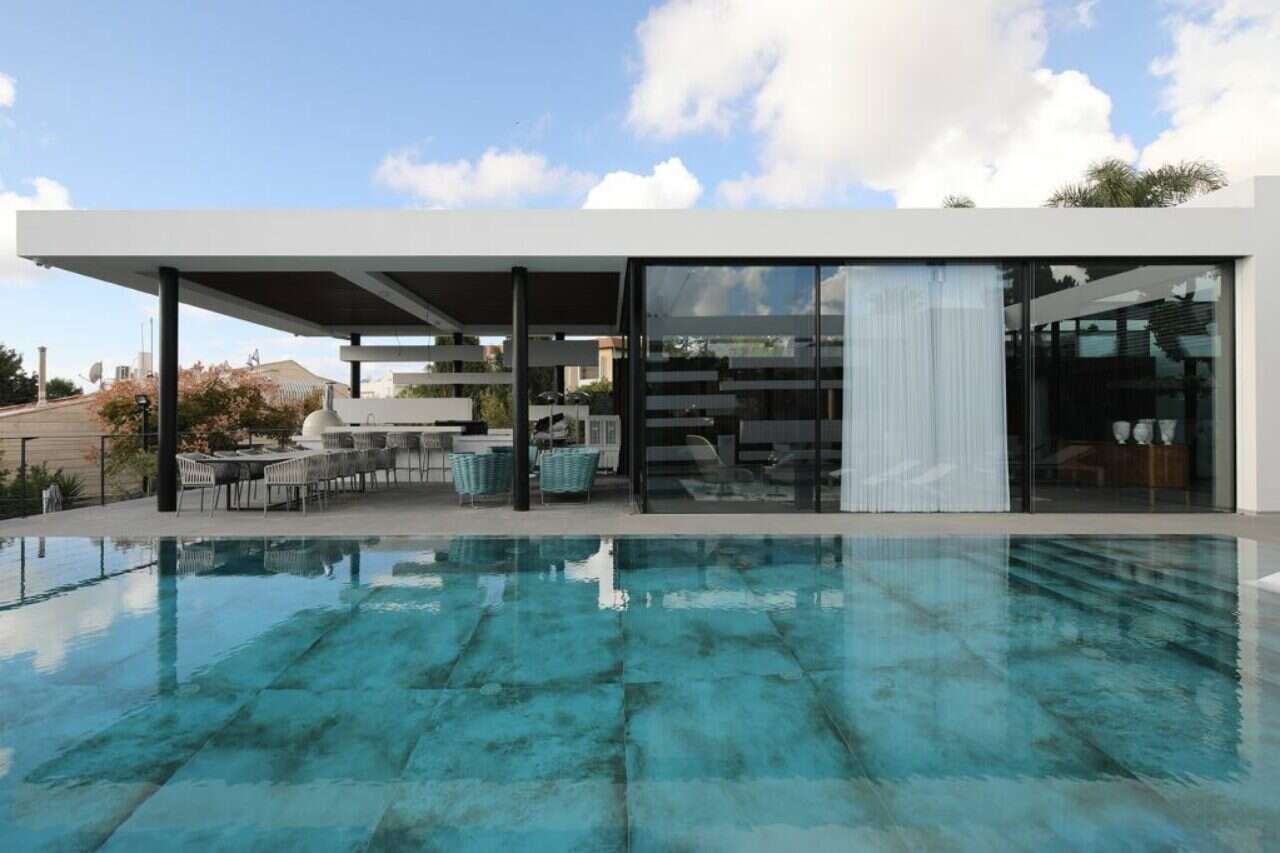 בעלי הבית מארחים הרבה, לכן חשוב היה לייצר עבורם מרחב אירוח שיאפשר אינטראקציה מלאה בין כלל המשתתפים. לשם כך תכננו האדריכלים בריכה במפלס הסלון והמטבח, שנראית כתלויה ומרחפת באוויר וצופה לנוף המרהיב ופתוח. בחללי הפנים תוכננו מטבח ופינת אוכל רחבי ידיים שחולקים את אותו החלל.