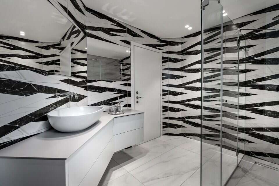 שחור-לבן: מפגן מחודד על קירות חלל הרחצה.