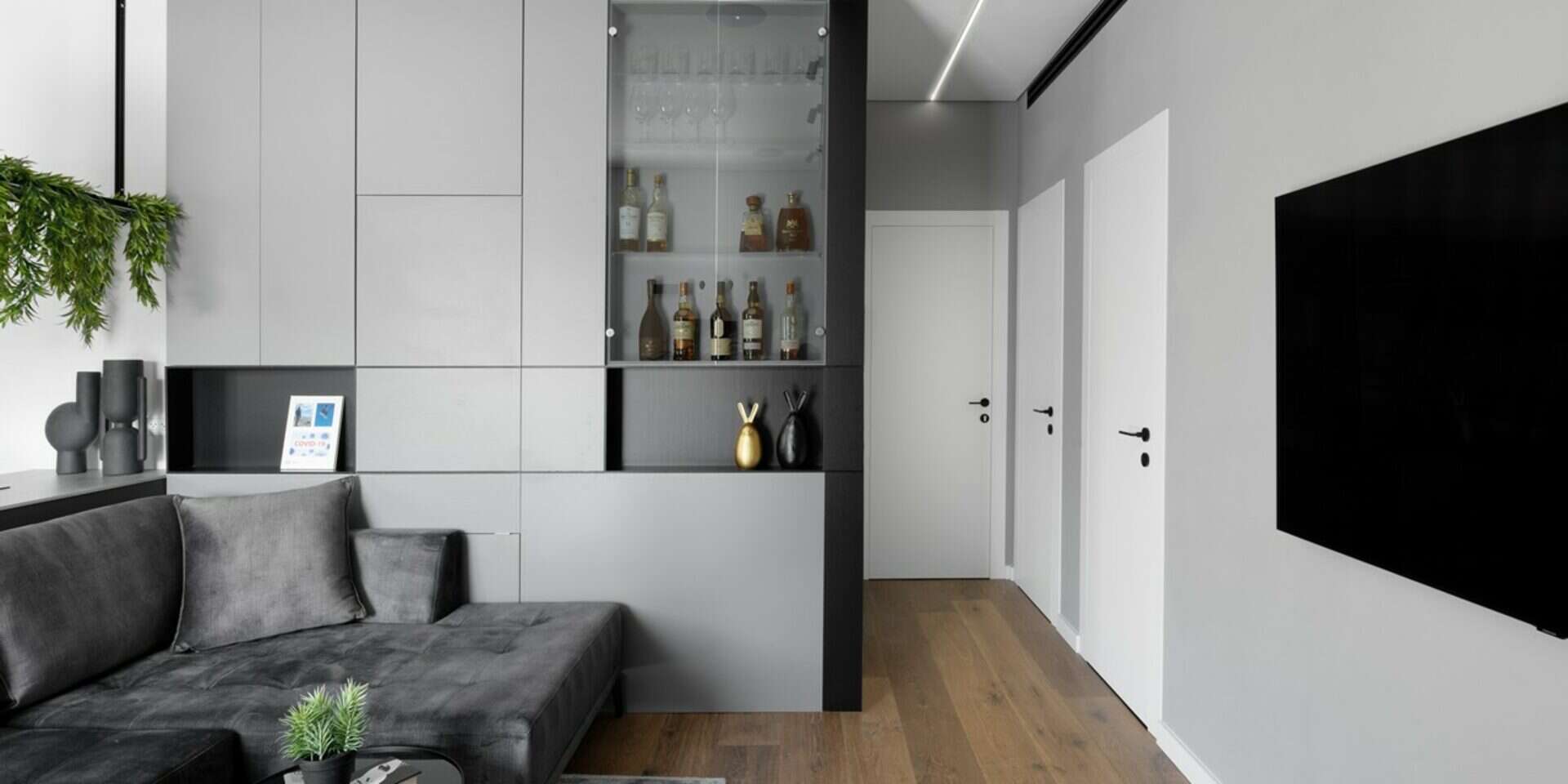 הסיפור של הדירה: דירת 50 מ"ר ברחוב דיזנגוף בתל אביב בבניין ישן, מחולקת ל-3 חדרים. הדירה עוצבה עבור גבר רווק שאוהב מאוד צבעים כהים, גוונים אפורים וסגנון מודרני. כל אלו באו לידי ביטוי בכל חלקי הדירה. הדרישה הייתה ליצור אווירה של מלון בוטיק עם תחושה של בית. מדובר בשיפוץ כולל, מרמת המעטפת, החלפת אלומיניום, הריסה של כל הקירות, רצפה ועד הסטיילינג הסופי. בחדר השינה תוכנן ארון עם חזית מראה כדי לתת תחושה של גודל ומרחב. הנוף האורבני שרואים מהמרפסת משתקף במערך המראות ומכניס ממד עיצובי חשוב לחלל.