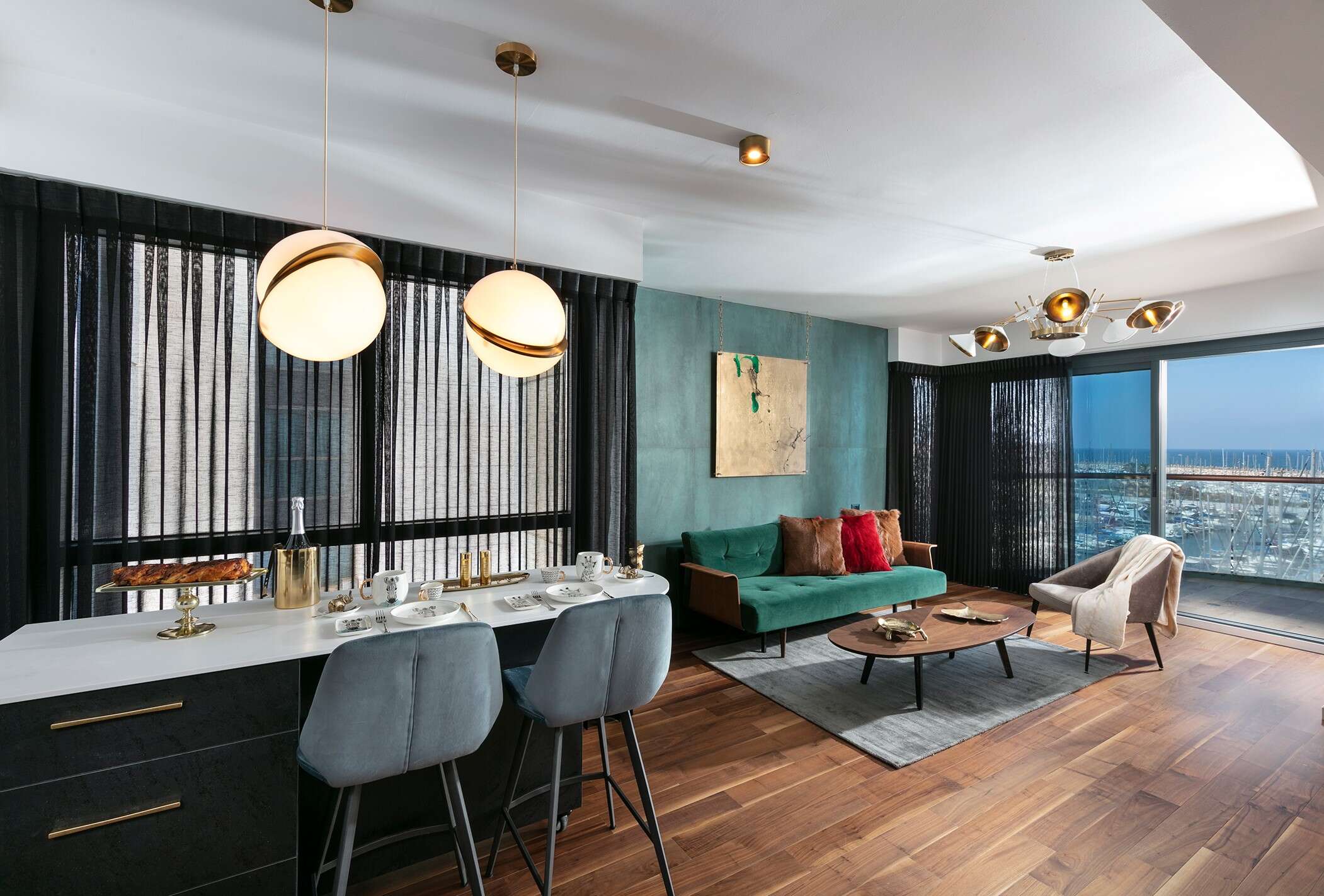 החלק המיוחד ביותר בדירה: האי שתוכנן כפינת אוכל, ואזור עבודה שמשקיף לים וגם לבריכה המשותפת.