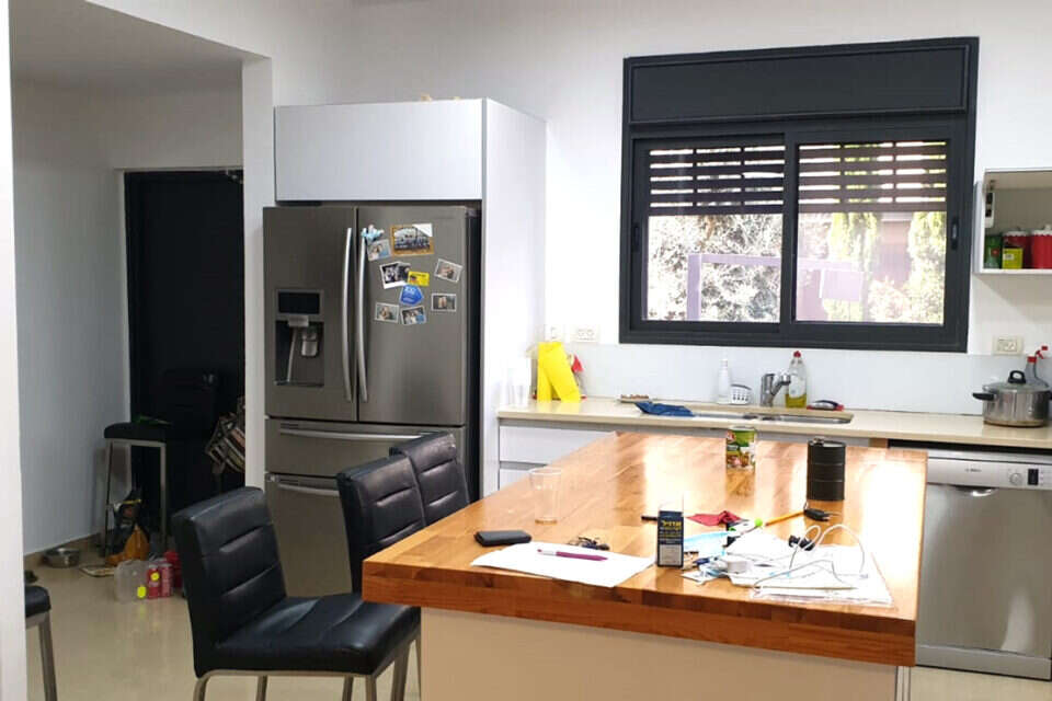 המטבח המוזנח התחלף באחד מעוצב, אך חשוב מכך, פרקטי ונגיש - חלונות המטבח הוגדלו כדי להכניס אל החלל אור ואוויר, המזווה נסגר לחדר שהכניסה אליו היא באמצעות דלת סתרים שנראית כמו אחת מחזיתות המטבח. המקרר והמדיח אינטגרליים, עם תנור ומיקרו בילט אין. במטבח שפע פתרונות אחסון שמאפשרים תפעול והתנהלות יעילים ונוחים. התאורה שנבחרה היא תאורה שקועה בהנמכת גבס, במטרה להדגיש מראה נקי ומינימליסטי.