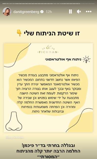 "נכנסת למיטה היום, בידיעה שמחר אני קמה לחדר ניתוח", עדכנה גרינברג את מאות אלפי עוקביה, על רקע תמונה שלה שוכבת במיטה. "לא כי בא לי, לא כי אני רוצה, כי אני צריכה", הבהירה, כנראה מתוך ציפייה שהעוקבים יחשבו שהיא עוברת ניתוח קוסמטי. "אלה שאריות של התאונה שעברתי בחודש מרץ, הכניסו אותי לניתוח SOS באף המרוסק, חודש לפני החתונה, והבהירו שאצטרך ניתוח נוסף", שיתפה.