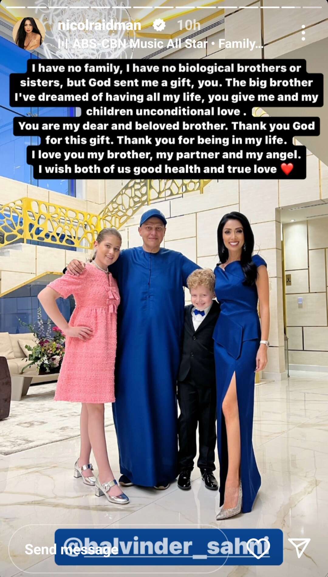 "אין לי משפחה. אין לי אחים או אחיות ביולוגיים, אבל אלוהים שלח לי אותך כמתנה", פתחה ראידמן את הברכה שהקדישה לשותף העסקי שלה על גבי תמונה של השניים כשהם לבושים בצבעים תואמים, לצד ילדיה מישל וריצ'י. "האח הגדול שחלמתי שיהיה לי כל חיי", הוסיפה ראידמן הנרגשת בסטורי, כשבסרטונים שקדמו לו אף שיתפה את מיליוני עוקביה במתנה שהעניק לה סהאני, רכב יוקרתי של רולס רויס בצבע ירוק, עם תקרה שמוארת בכוכבים. מדובר בצבע ייחודי, ולכן זהו הרכב היחיד מסוגו בעולם.