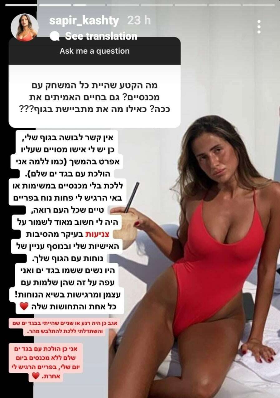 "מה הקטע שהיית כל המשחק עם מכנסיים? גם בחיים האמיתיים את ככה? כאילו מה, את מתביישת בגוף?" נשאלה קשתי, שמיהרה להבהיר: "אין קשר לבושה בגוף שלי", כשהיא מוכיחה את דבריה בבחירת התמונה בסטורי, שבה היא נראית לבושה בבגד ים אדום לוהט בגזרה שלמה, אבל כזה שלא מסתיר יותר מדי.