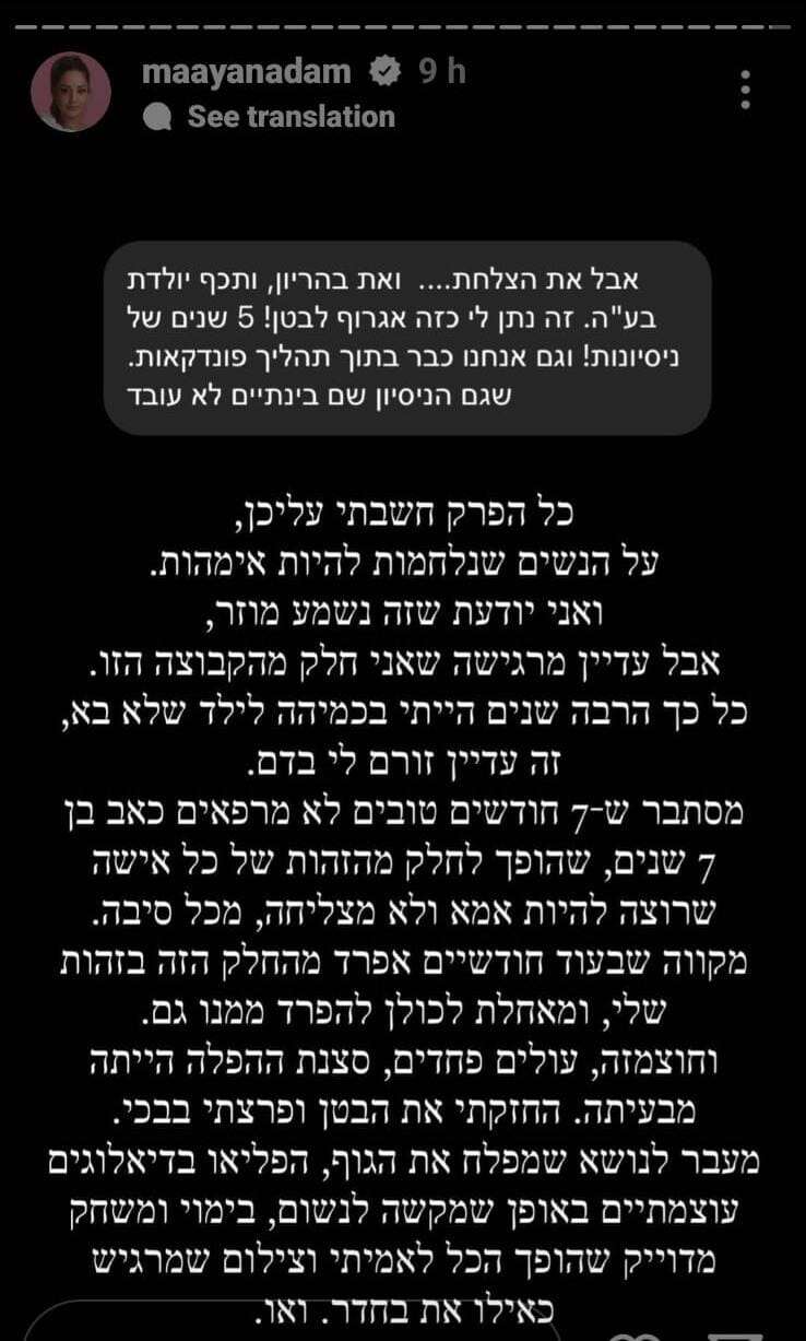 "אבל את הצלחת, ואת בהיריון ותכף יולדת בעזרת השם", כתבה לה הגולשת. "זה נתן לי כזה אגרוף לבטן", שיתפה את אדם. "חמש שנים של ניסיונות וגם אנחנו כבר בתוך תהליך פונדקאות, שגם הניסיון שם בינתיים לא עובד", הוסיפה בעצב, ושיתפה איתה את התהליך הקשה והמתיש במסע להורות.