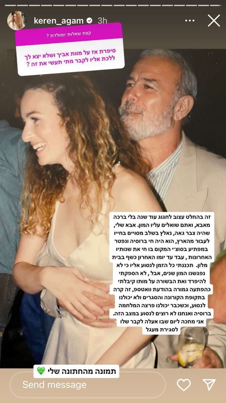 "סיפרת על מות אביך ושלא יצא לך ללכת אליו לקבר. מתי תעשי את זה?", נשאלה. "זה בהחלט עצוב לחגוג עוד שנה בלי ברכה מאבא", ענתה אגם, שבחרה להשיב על רקע תמונה משותפת שלה ושל אביה מיום חתונתה. "אתם שואלים עליו המון. אבא שלי, שהיה צבר גאה, נאלץ בשלב מסוים בחייו לעבור מהארץ. הוא חי ברוסיה ונפטר במפתיע בסוצ'י, במקום שבו חי את שנותיו האחרונות. הוא עבד עד יומו האחרון כשף בבית מלון".
