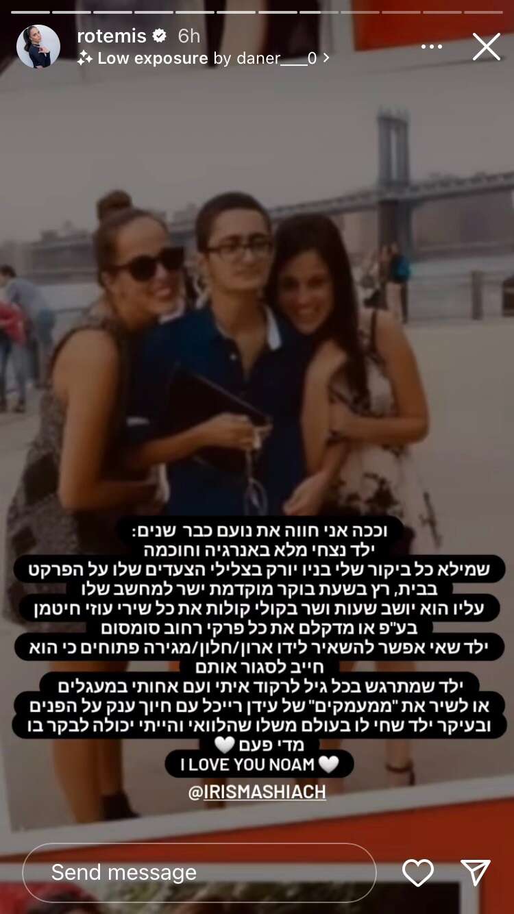 "זאת איריס, הדודה האהובה שלי, וזה נועם הבן שלה. נועם, בן 26, עם אוטיזם בתפקוד נמוך. אין מספיק מילים שיתארו כמה אני אוהבת אותו, ואת אימא שלו. איריס ובן זוגה אמנון הם מודל לחיקוי עבורי. 26 שנים של התמודדות ונתינה אינסופית לילד המיוחד שלהם. הם חיים בניו יורק, שם המעטפת לילדים על הרצף היא עד גיל 21. נועם הוא נשמה כל כך מיוחדת בעולם הזה".